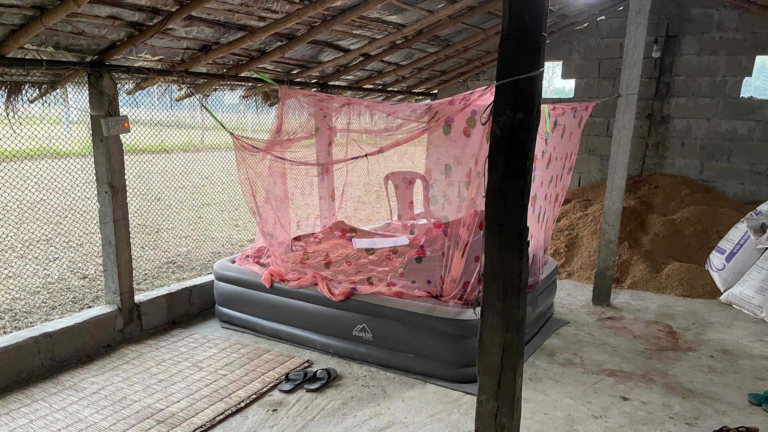 Madhus föräldrar har ett hönshus som inte är i bruk där de mer äventyrliga bröllopsgästerna kan sova under myggnät på enkla madrasser. Ta med öronproppar och varmt underställ. Det blir kyligt nattetid. (obs, bilden visar en uppblåsbar madrass, vill man sova på en sån måste man ta med sig hemifrån. Men det finns som sagt tunnare madrasser att låna)